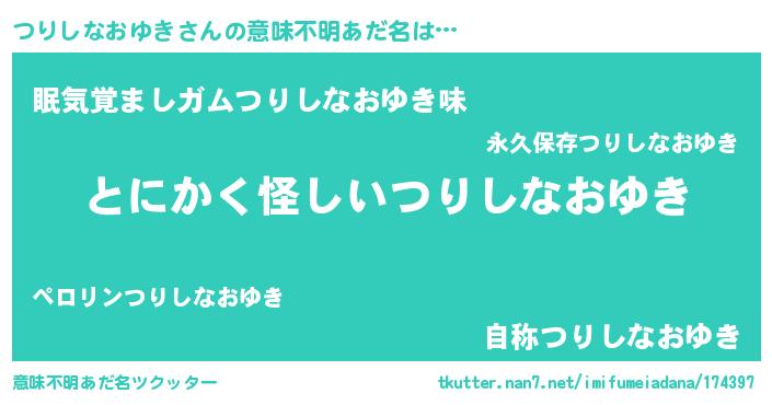 | 胡散臭い通販商品みたいなあだ名 | 『信頼と実績のサプリメント…その名も「つりしなおゆき」』 |