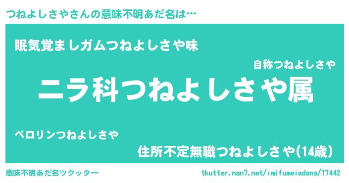 | 男性向けラノベタイトル風あだ名 | 『つねよしさや~年齢イコール彼女いない歴の魔法使い~』 |