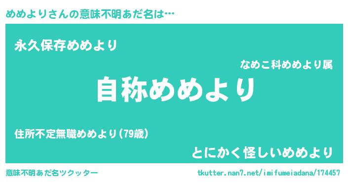 | 男性向けラノベタイトル風あだ名 | 『Re:めめよりから始める異世界生活』 |