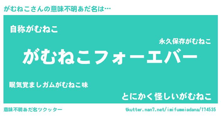 | 女子向けラノベタイトル風あだ名 | 『がむねこの雑貨屋さん』『闇のがむねこ』 |