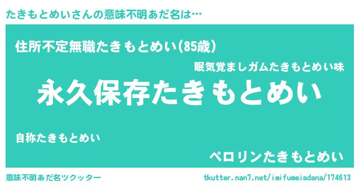 | ヘコむあだ名 | 『たきもとめい(笑)』『たきっふぃ~』 |