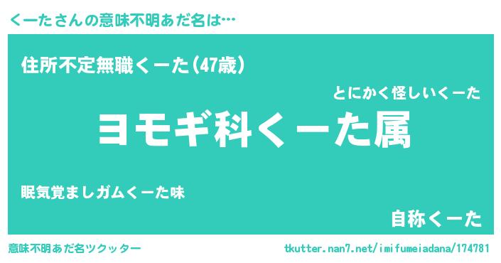 | 男性向けラノベタイトル風あだ名 | 『くーた~年齢イコール彼女いない歴の魔法使い~』 |