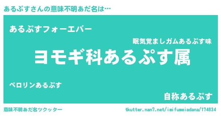 | 男性向けラノベタイトル風あだ名 | 『うちのあるぷすが世界を掌握している!』 |