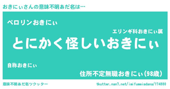 | 男性向けラノベタイトル風あだ名 | 『ダンジョンにおきにぃを求めるのは間違っているだろうか』 |
