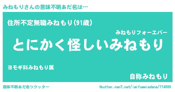 | 男性向けラノベタイトル風あだ名 | 『みねもりの嫁は女の子じゃないと思った?』 |