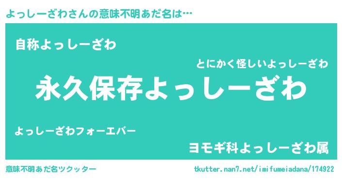 | 男性向けラノベタイトル風あだ名 | 『よっしーざわという概念が存在しない退屈な世界 』 |