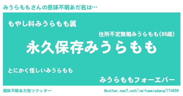| 胡散臭い通販商品みたいなあだ名 | 『絶対に幸福をもたらす水素水…その名も「みうらもも」』 |