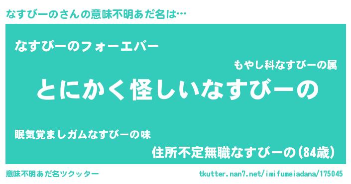 | 女子向けラノベタイトル風あだ名 | 『なすびーのは平凡を望む』 |