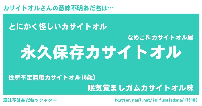 | 男性向けラノベタイトル風あだ名 | 『カサイトオルという概念が存在しない退屈な世界 』 |