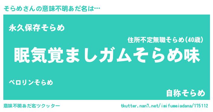 | ヘコむあだ名 | 『そらめ(笑)』『そらもー』『そらを』 |