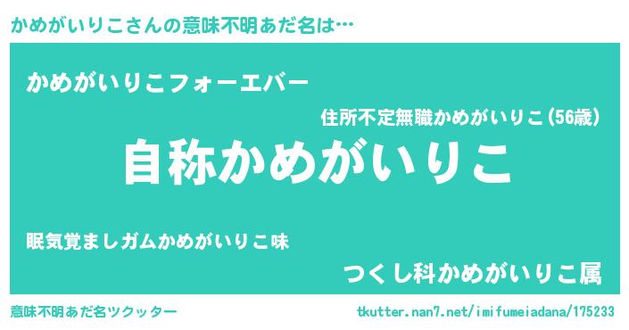 | 肩書あだ名 | 『かめがいりこ総統』『かめがいりこ大将』 |