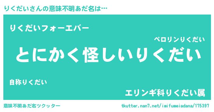 | 男性向けラノベタイトル風あだ名 | 『りくだいの嫁は女の子じゃないと思った?』 |