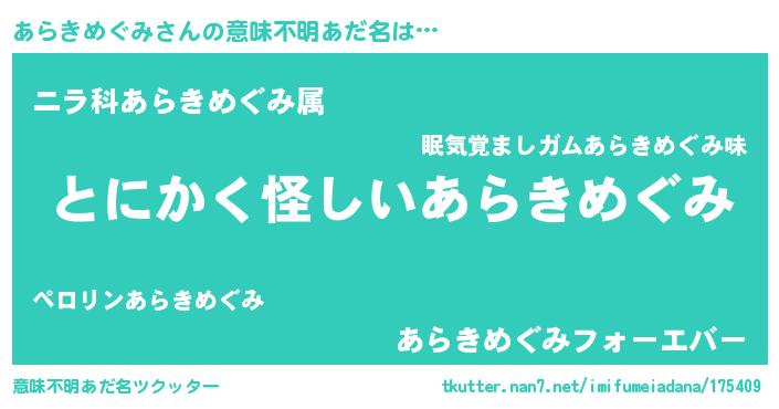 | ポケモン風あだ名 | 『ヒアラキメグミ』『アラキング』 |