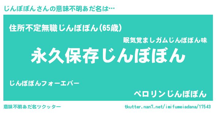 | 男性向けラノベタイトル風あだ名 | 『じんぼぼんという概念が存在しない退屈な世界 』 |