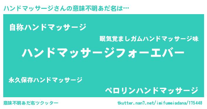| 男性向けラノベタイトル風あだ名 | 『ハンドマッサージに滅ぼされるだけの簡単なお仕事です』 |