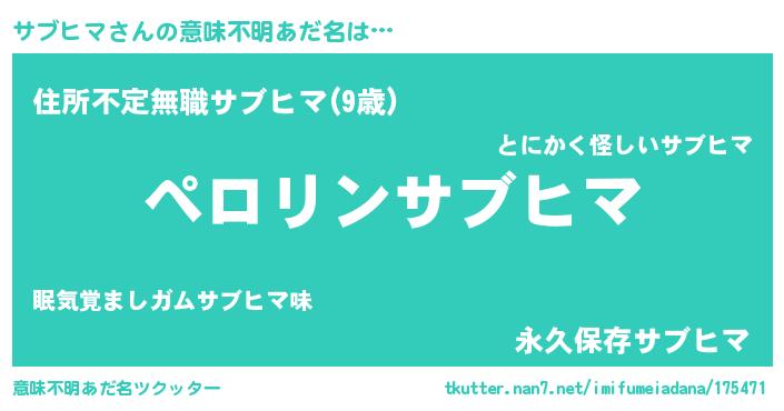 | 男性向けラノベタイトル風あだ名 | 『サブヒマの憂鬱』『魔弾の王とサブヒマ』 |