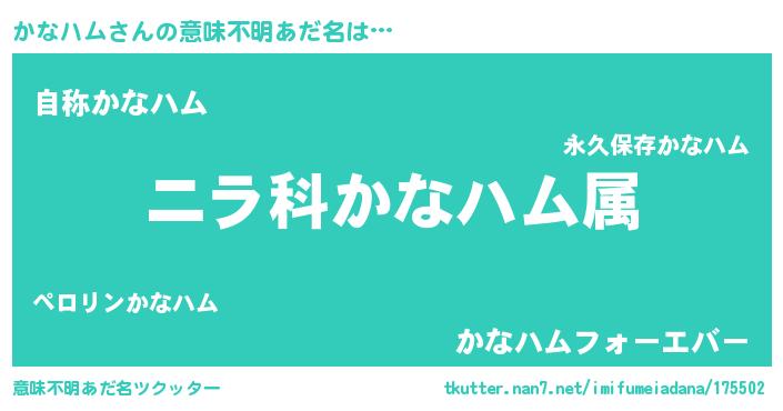 | 男性向けラノベタイトル風あだ名 | 『かなハムに滅ぼされるだけの簡単なお仕事です』 |