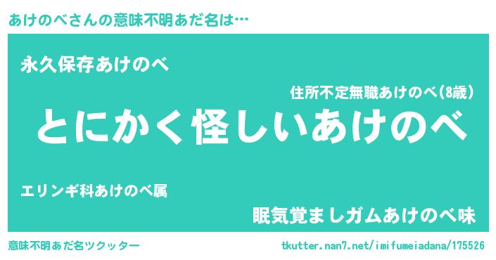 | 男性向けラノベタイトル風あだ名 | 『ダンジョンにあけのべを求めるのは間違っているだろうか』 |