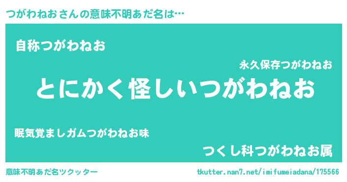 | 男性向けラノベタイトル風あだ名 | 『つがわねおに滅ぼされるだけの簡単なお仕事です』 |