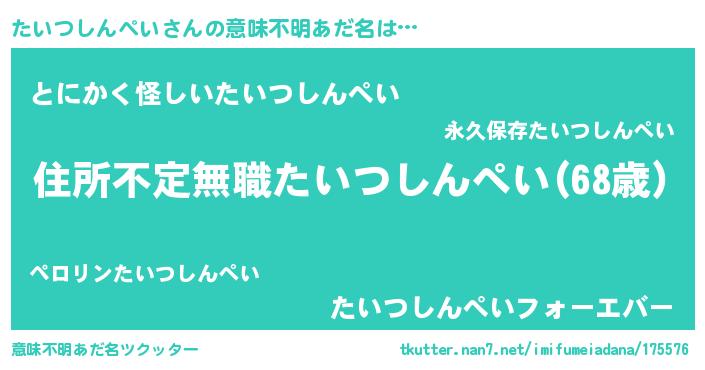 | 男性向けラノベタイトル風あだ名 | 『この素晴らしい世界にたいつしんぺいを!』 |