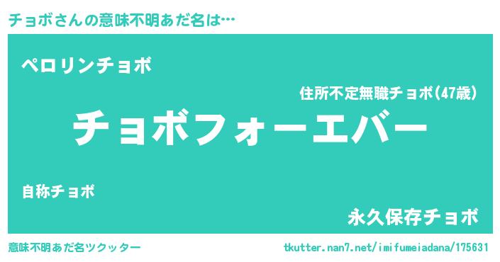 | 男性向けラノベタイトル風あだ名 | 『やはりチョボの青春ラブコメはまちがっている 』 |