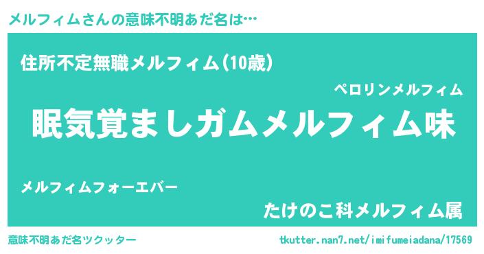 | 男性向けラノベタイトル風あだ名 | 『おまえをオタクにしてやるから、俺をメルフィムにしてくれ! 』 |
