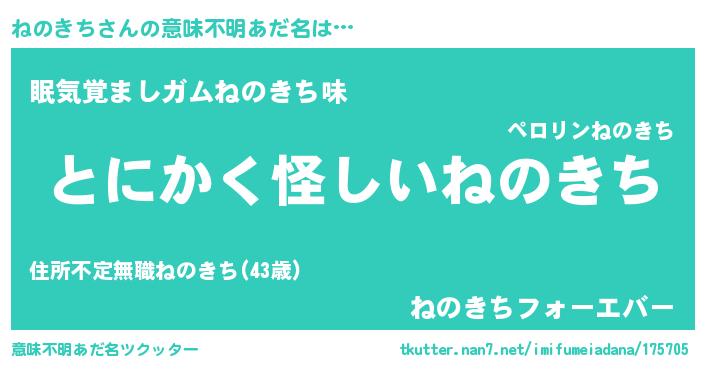 | 男性向けラノベタイトル風あだ名 | 『ねのきちの嫁は女の子じゃないと思った?』 |