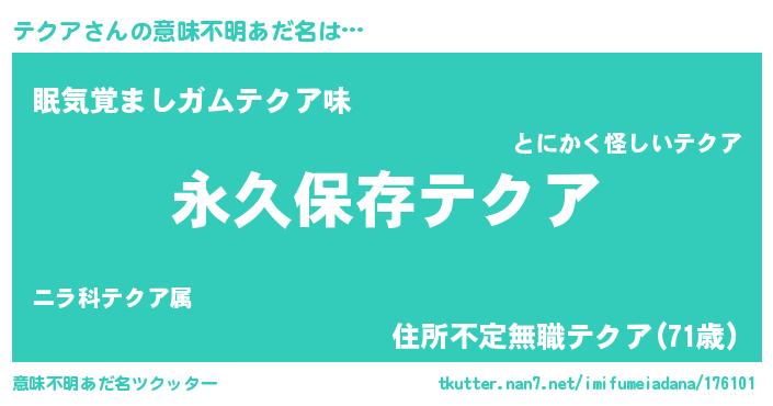 | 男性向けラノベタイトル風あだ名 | 『テクアという概念が存在しない退屈な世界 』 |