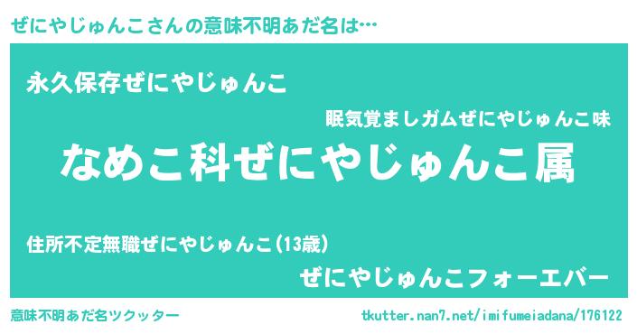 | 男性向けラノベタイトル風あだ名 | 『転生したらぜにやじゅんこだった件』 |