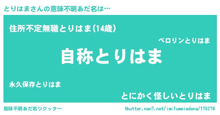| 男性向けラノベタイトル風あだ名 | 『Re:とりはまから始める異世界生活』 |