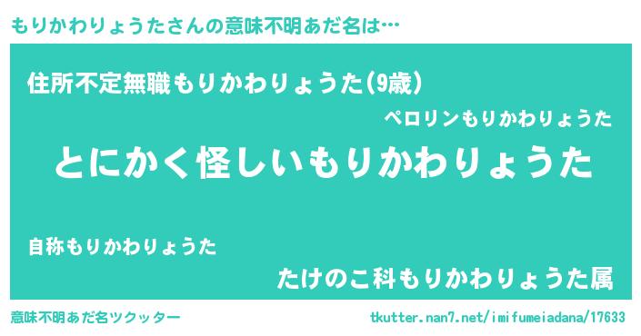 | 男性向けラノベタイトル風あだ名 | 『もりかわりょうたの嫁は女の子じゃないと思った?』 |