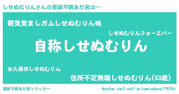 | 欧米人風あだ名 | 『しせぬむりん・ステッグマイヤー』 |