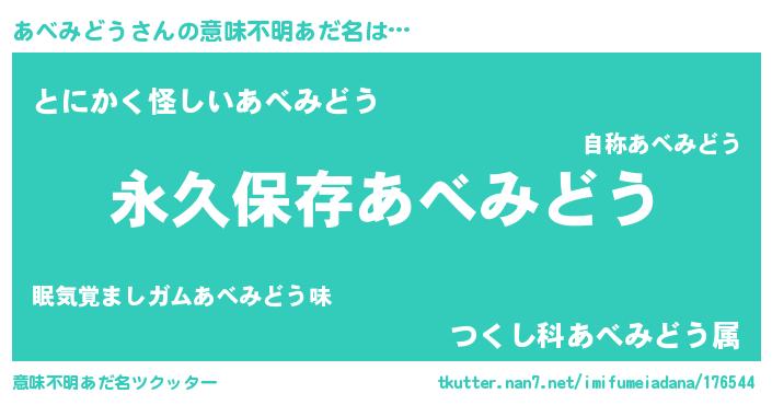 | 男性向けラノベタイトル風あだ名 | 『うちのあべみどうが世界を掌握している!』 |