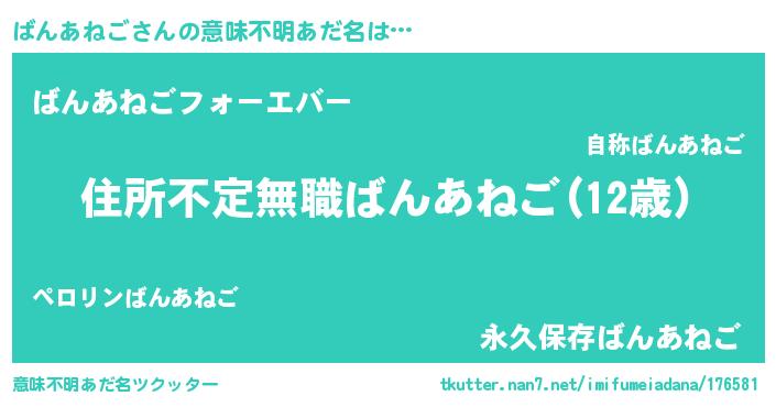 | 男性向けラノベタイトル風あだ名 | 『この素晴らしい世界にばんあねごを!』 |