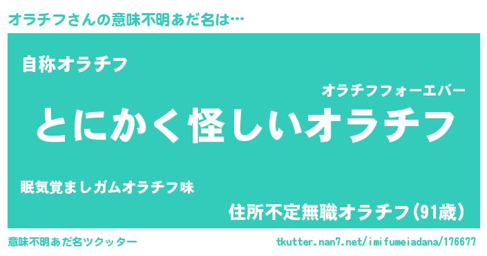 | 男性向けラノベタイトル風あだ名 | 『オラチフの嫁は女の子じゃないと思った?』 |