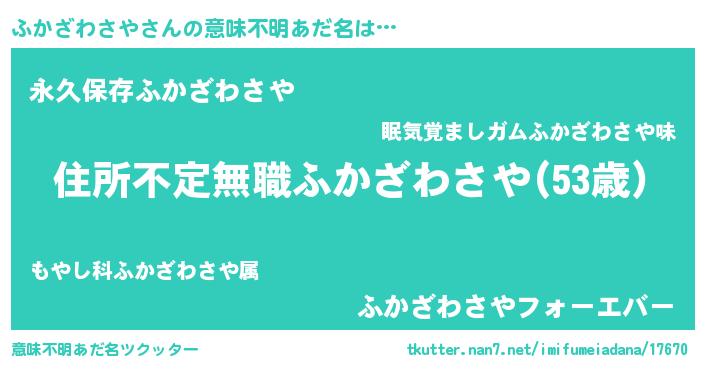 | 男性向けラノベタイトル風あだ名 | 『この素晴らしい世界にふかざわさやを!』 |
