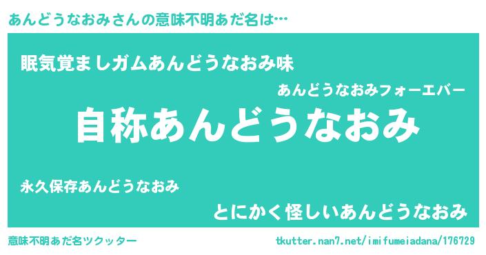 | 男性向けラノベタイトル風あだ名 | 『Re:あんどうなおみから始める異世界生活』 |