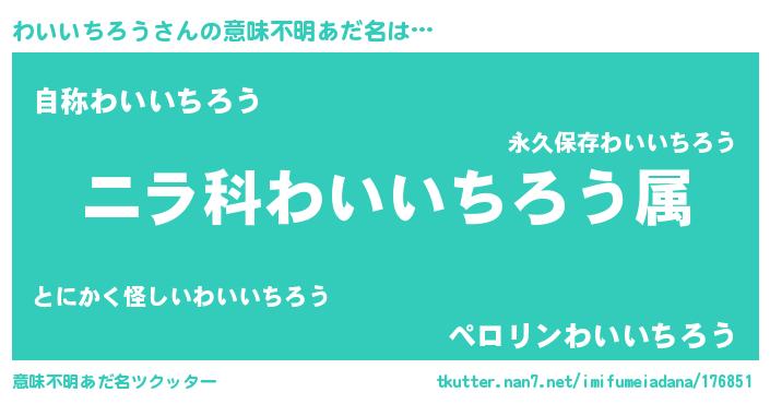 | 男性向けラノベタイトル風あだ名 | 『わいいちろう~年齢イコール彼女いない歴の魔法使い~』 |