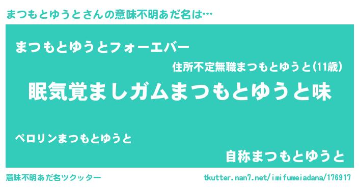| 男性向けラノベタイトル風あだ名 | 『うちのまつもとゆうとが世界を掌握している!』 |