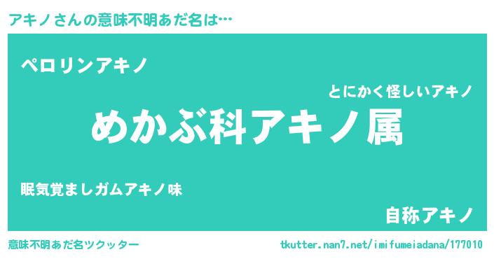 | 男性向けラノベタイトル風あだ名 | 『アキノスレイヤー』 |