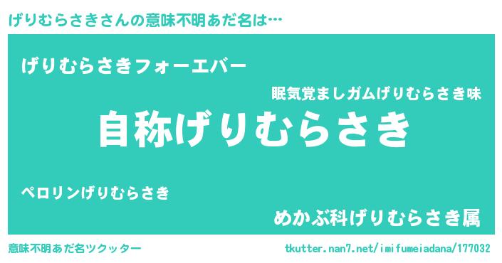 | 女子向けラノベタイトル風あだ名 | 『げりむらさきなんてお断りですっ。』 |