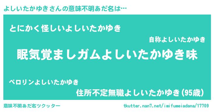 | 男性向けラノベタイトル風あだ名 | 『ノーゲーム・ノーヨシイタカユキ』 |