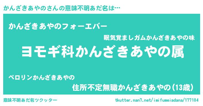 | 男性向けラノベタイトル風あだ名 | 『かんざきあやの~年齢イコール彼女いない歴の魔法使い~』 |