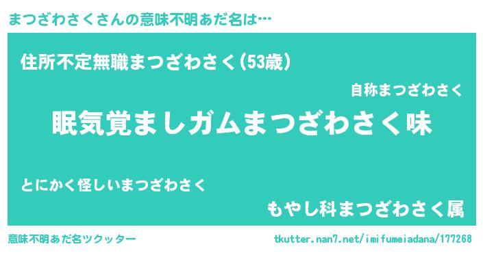 | 男性向けラノベタイトル風あだ名 | 『おまえをオタクにしてやるから、俺をまつざわさくにしてくれ! 』 |