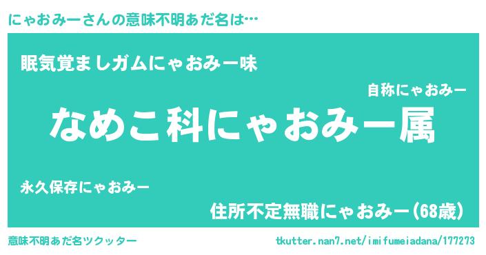 | 男性向けラノベタイトル風あだ名 | 『転生したらにゃおみーだった件』 |