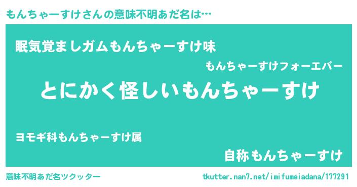 | 男性向けラノベタイトル風あだ名 | 『もんちゃーすけの嫁は女の子じゃないと思った?』 |