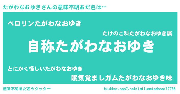 | 男性向けラノベタイトル風あだ名 | 『Re:たがわなおゆきから始める異世界生活』 |
