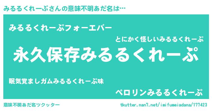 | 男性向けラノベタイトル風あだ名 | 『みるるくれーぷに滅ぼされるだけの簡単なお仕事です』 |