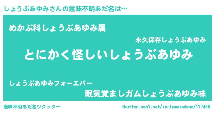| 胡散臭い通販商品みたいなあだ名 | 『伝統あるサプリメント…その名も「しょうぶあゆみ」』 |