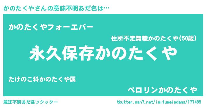 | 男性向けラノベタイトル風あだ名 | 『かのたくやという概念が存在しない退屈な世界 』 |